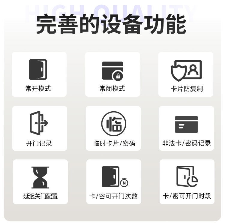 宜宾这款智能门锁提供室内门锁和防盗门锁两种选择,其中室内门锁尺寸为 2806521mm,适配 5050 锁体;防盗门锁尺寸为 3657021mm,适配 6068 锁体,可满足不同场景的安装需求。它采用铝合金一体成型搭配钢化玻璃面板打造,兼具坚固耐用的品质与简洁美观的视觉效果。门锁支持蓝牙无线通讯,解锁方式丰富多样,密码、卡片、蓝牙、钥匙四种方式随心选择,满足不同使用习惯与应急需求。其工作温度范围为 - 20~70℃,能适应多数地区的气候条件,采用碱性电池供电,安装更换便捷,是兼具安全性与实用性的门锁选择。